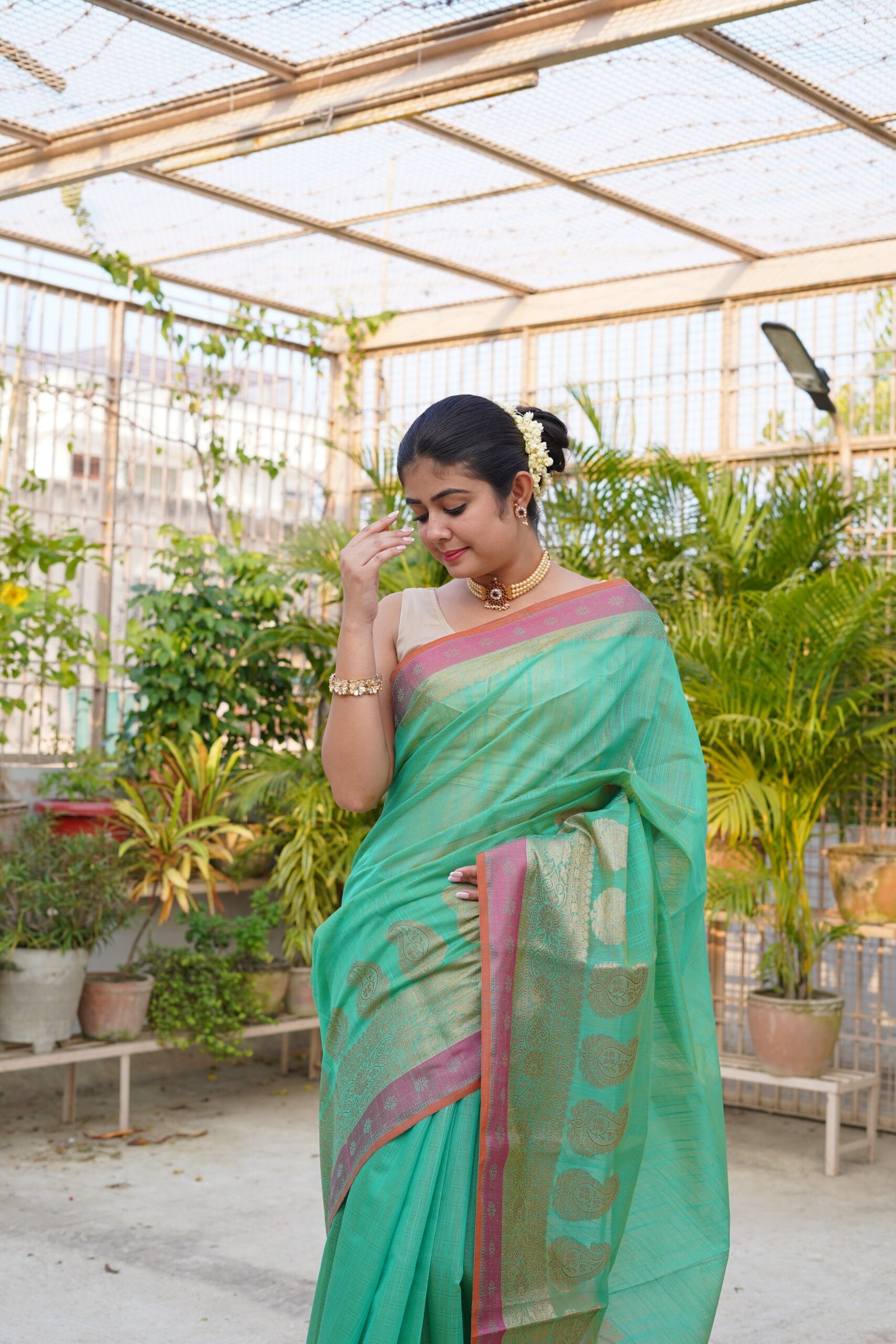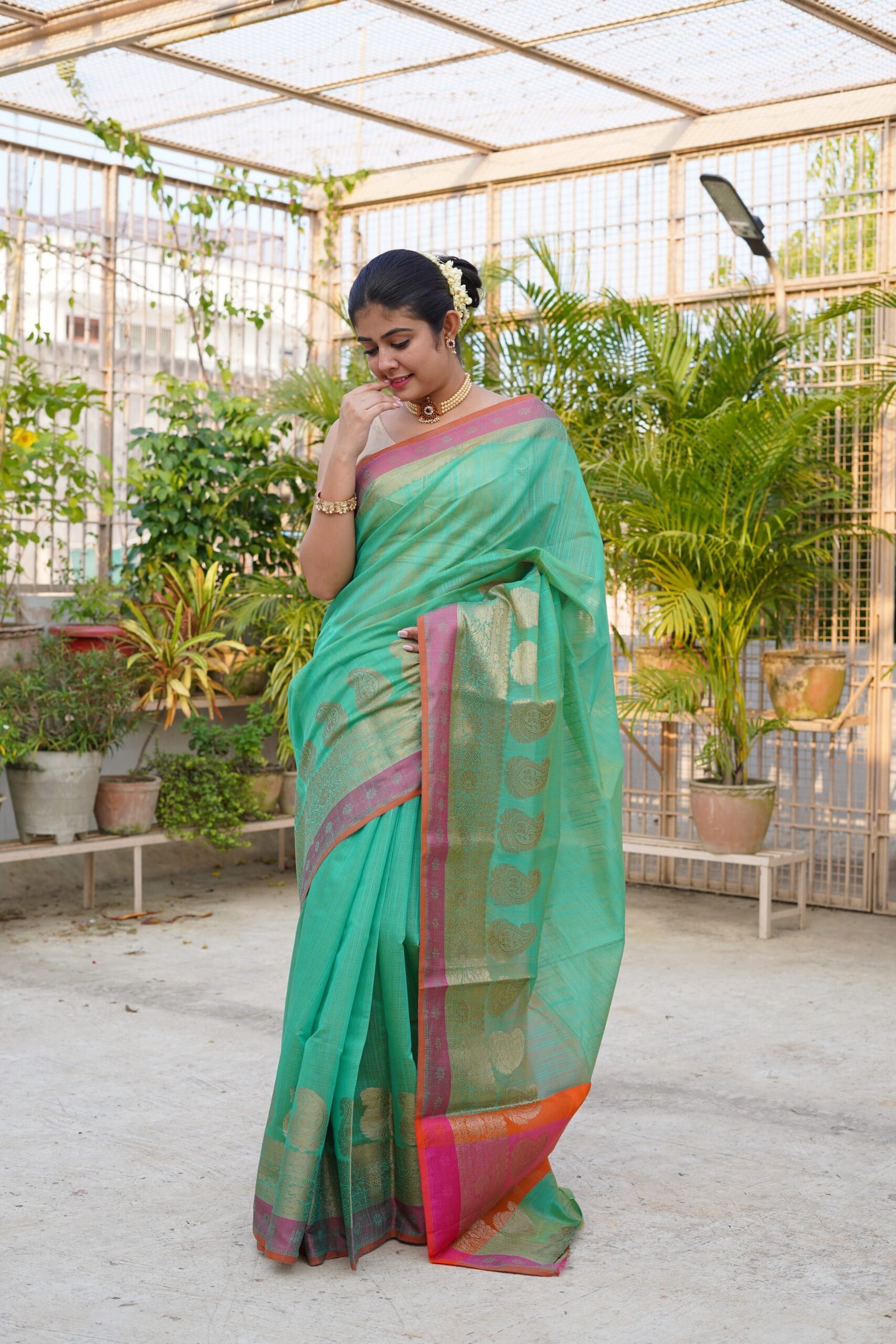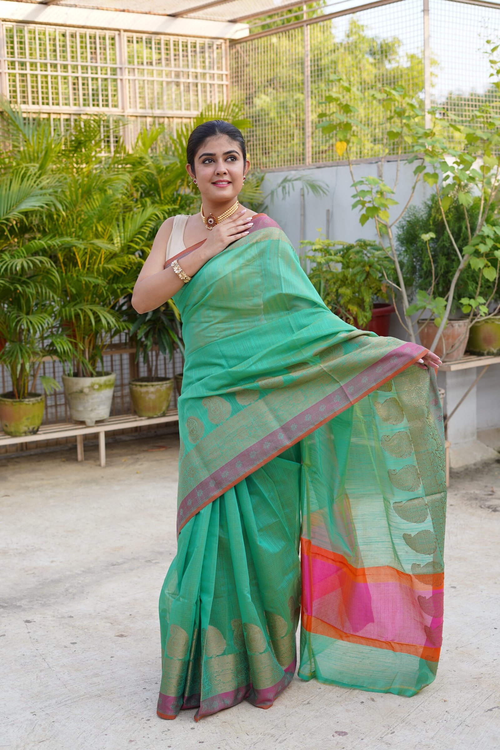| Green Colour Zari skirt Border PlainĀ Banarasi Saree with contrast blouse & Rich Pallu |