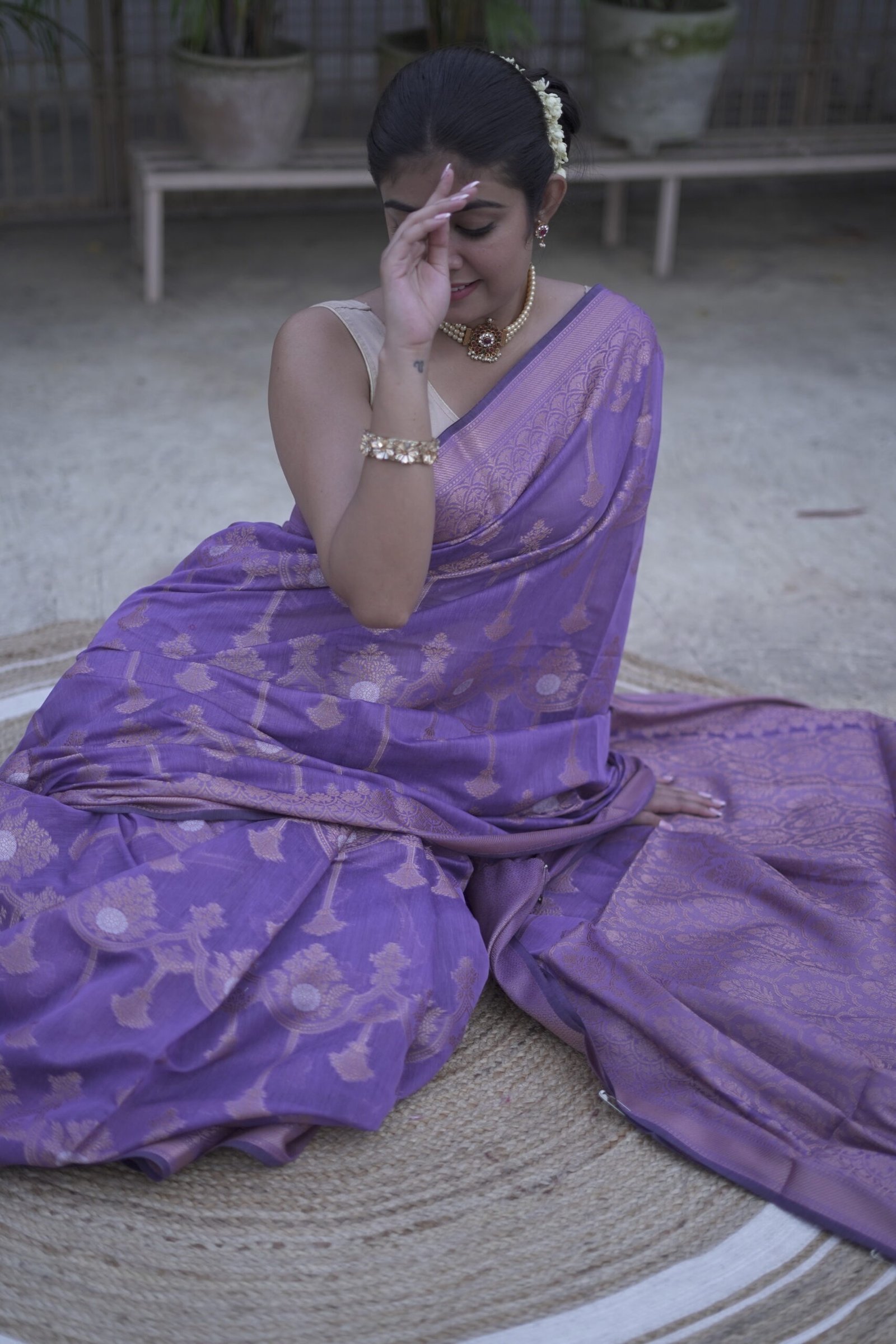 Orchid colour Semi CottonĀ  Banarasi Saree with Golden Zari work and Meena & Jal workhaving Rich Pallu